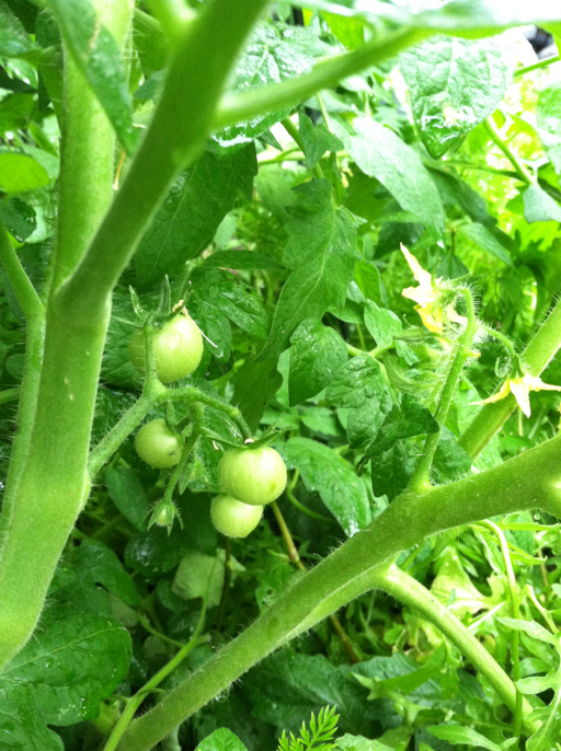 Finally, I staked the tomatoes. They were collapsing under their own weight and taking down with them their neighboring carrots. My tomato plants can now breath easier and grow towards the sun.